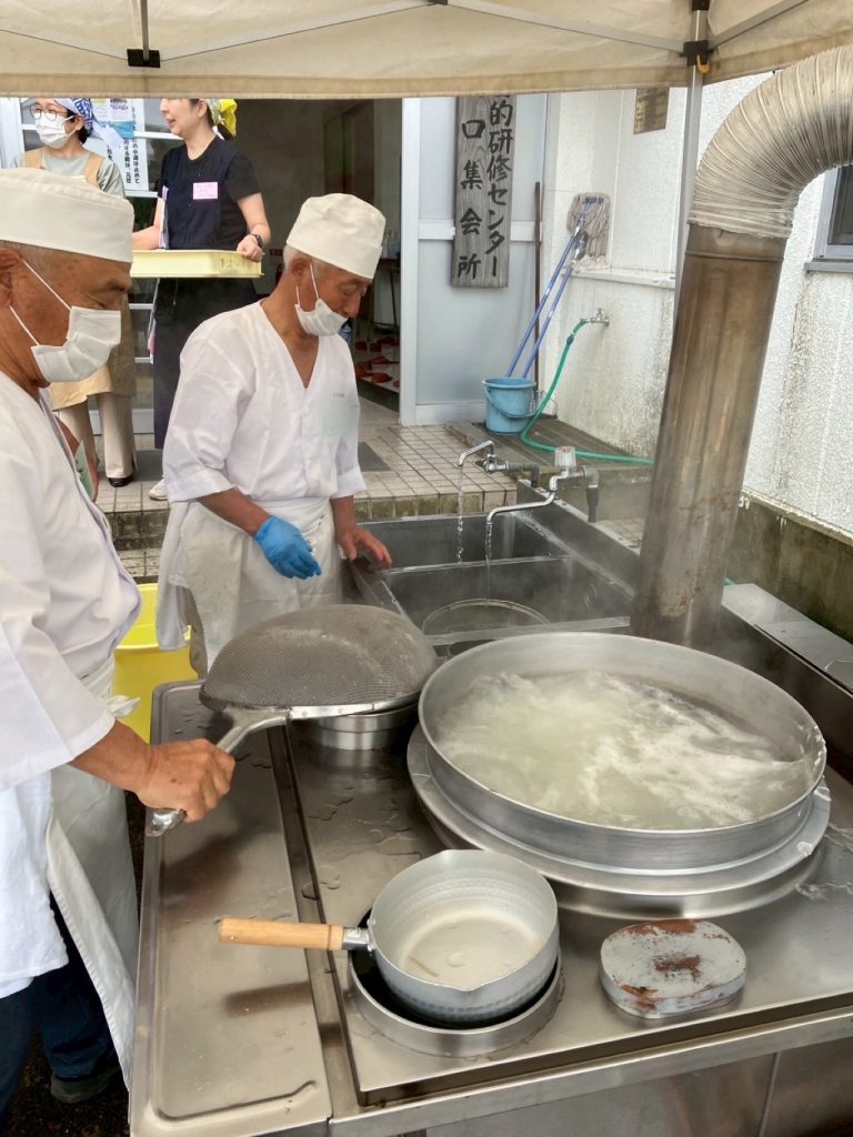 蕎麦が打ち終わると講師の皆さんに美味しく茹でていただき、グループごとに実食です!