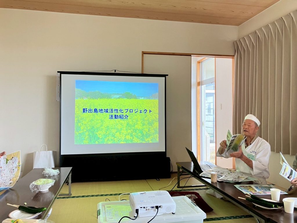 美味しくいただいた後には、野出島地域活性化プロジェクトの活動について、代表の本宮さんよりスライドを用いながらお話を伺いました。