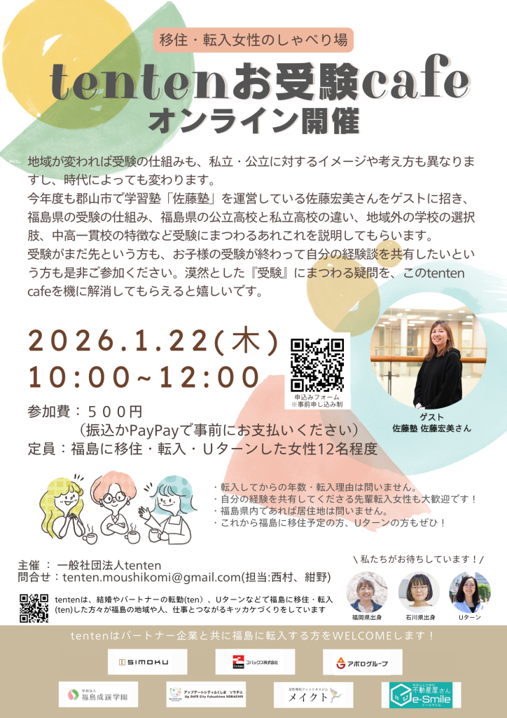 ※事務局からの返信をもって受付と致します。送信後3日経っても返信がない場合は、024‐529‐5895(tenten)までご連絡ください。
