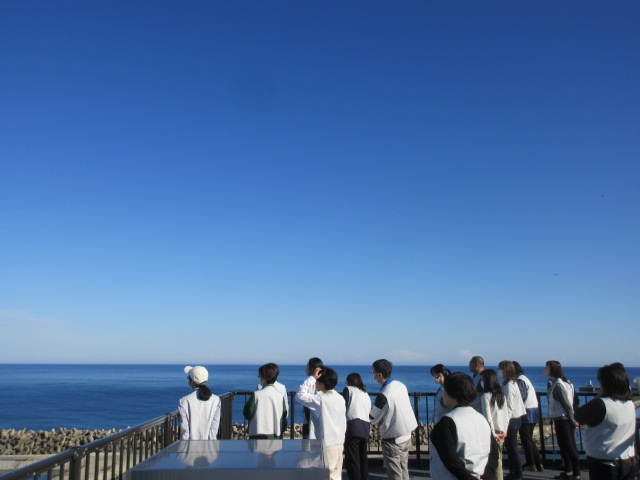 この日はちょうど16回目の処理水排出が終わる日で、処理水の放出が進む中、タンクの解体も進んでいるとのことでした。原発周辺には以前桜が1,000本も植えられていて、本来はとても美しい場所だそうです。この日は晴れて暖かく、海の波も穏やか。景色の美しさと今の現状との対比に心が痛んだ、と話す参加者さんもいました。