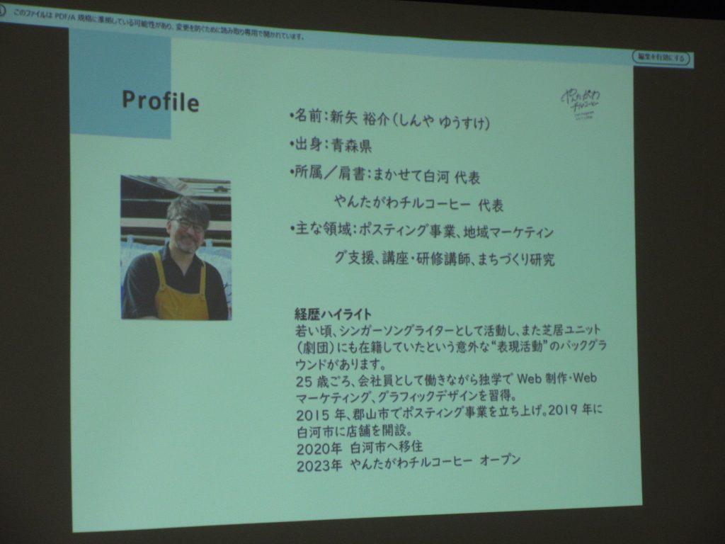 参加者のみなさんからの質疑応答では、白河でなにかやってみたいという想いはあるものの、まだ自分に何ができるのか?何がやりたいのか明確になっていない…足踏み状態…というご意見が多くありました。ゲストのお二人が歩んできた道が決して1本道であったわけではなく、小さなきっかけから枝分かれのように派生していっているというお話を聞き、参加者のみなさんの気持ちも少し楽になったのではないでしょうか。