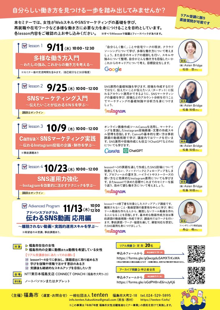 「久しぶりに働きたいけれどブランクが不安」「子育てと両立できる働き方に挑戦したい」——そんな思いを持つ女性たちを応援するために福島市主催、tenten企画・運営で開催しました。今年はSNSマーケティングをテーマにバージョンアップ。ツール操作だけでなく “必要な人に情報を届ける考え方” まで学べるより実践的な内容にしました。