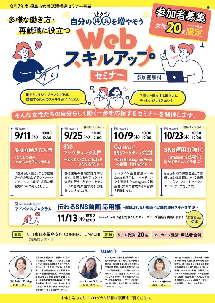 講師は昨年に続き(株)AsianBridge (本社東京)富山LABからの松田悠さん・松島知佳さんに加え、今年は福島県北エリアを中心にInstagram運用だけでなく広告運用までサポートをしているファンギミックス株式会社の舟山萌さんにも講師を依頼しました。